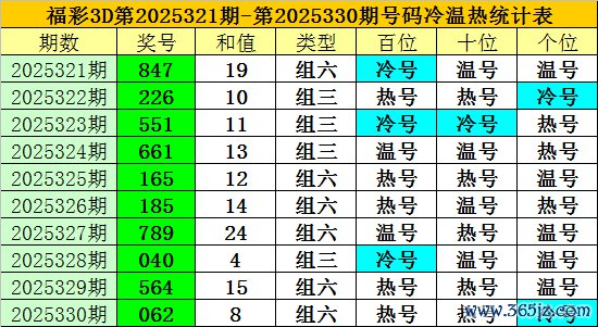 上期纪念:福彩3D第2025330期开奖奖号为:062,奖号类型为:组六,奖号冷温热态为:热号+热号+冷号。